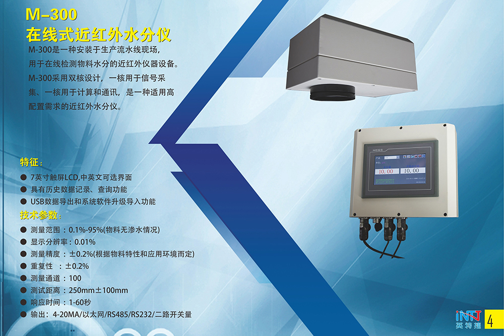 M-300近紅外水分儀的構成:M-300是在M-100基礎上進(jìn)行升級的高配置在線(xiàn)水分分析儀。儀器采用雙核心設計,主要部件為近紅外探頭和顯示器兩部分。